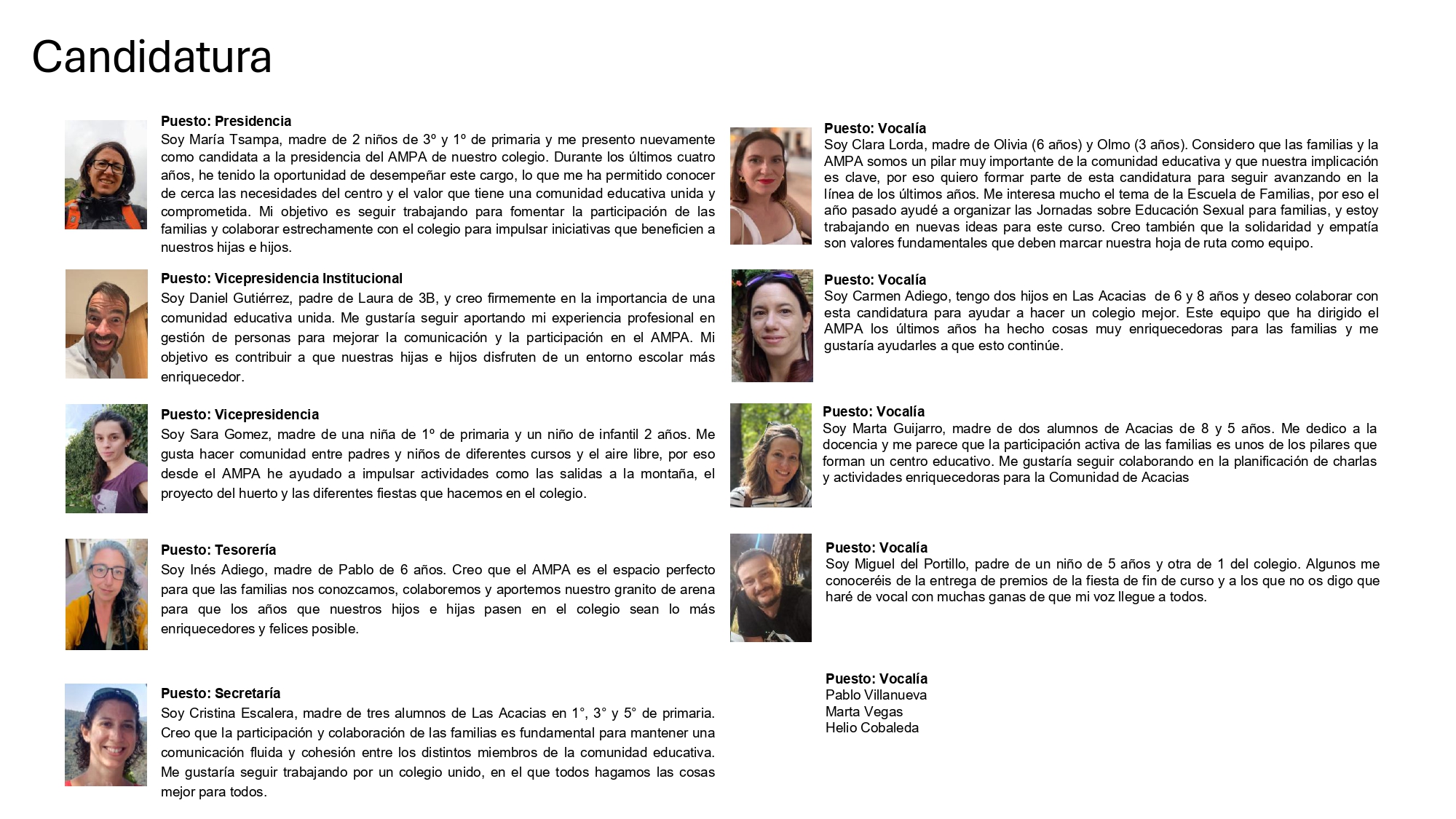 Tras las elecciones celebradas recientemente, nos complace presentar a la nueva Junta Directiva del AMPA de Las Acacias, un equipo lleno de ilusión, compromiso y ganas de seguir construyendo una comunidad educativa unida y participativa.